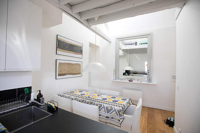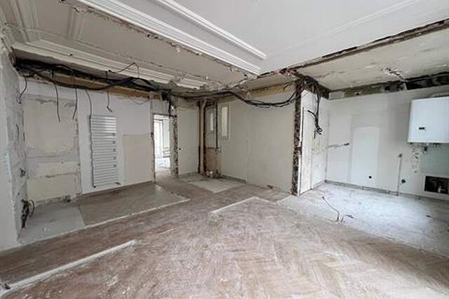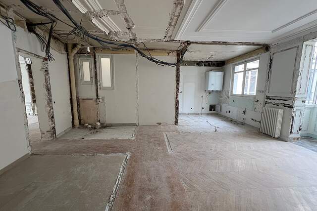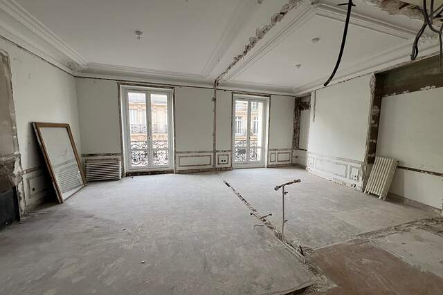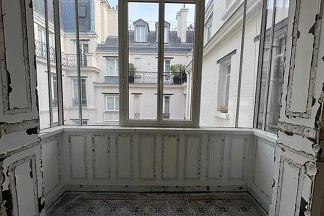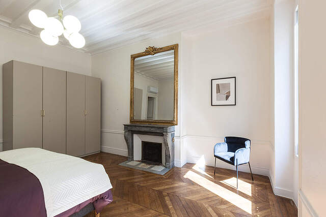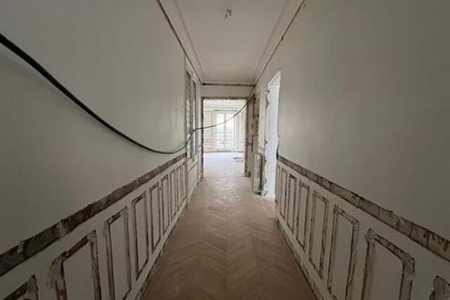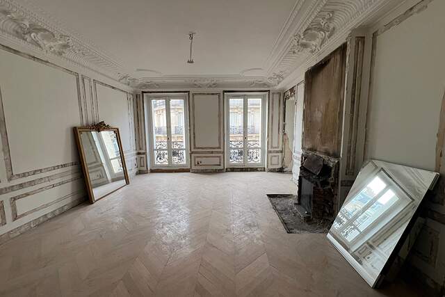 Площадь апартамента составляет 200 квадратных метров, она находится на первом французском этаже здания, имеет элегантный паркет, высокие окна и светлый интерьер с большим количеством естественного света.
