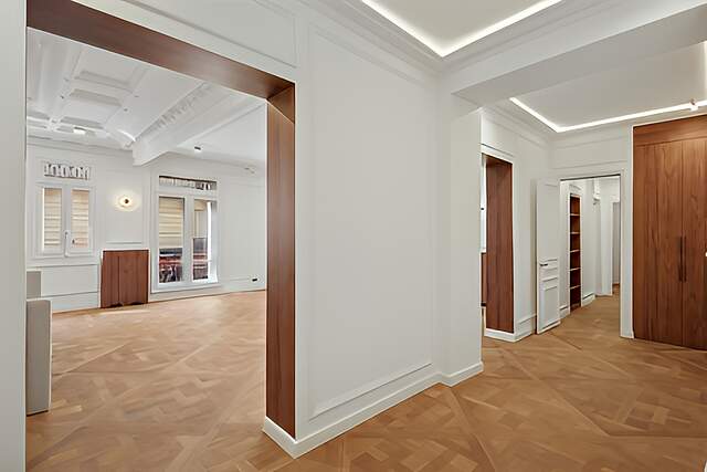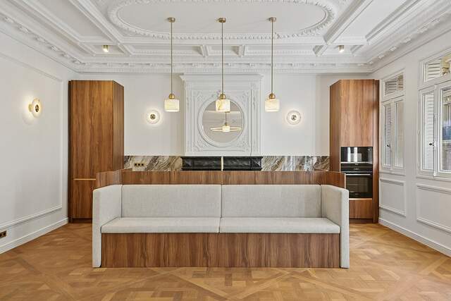 Исторические детали — паркет, лепнина и камины — формируют атмосферу аутентичного Парижа.